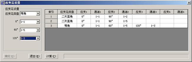 的测量,可以测得测点的主应力大小、方向,以及最大剪应力的大小。通常使用两种应变花的贴片方式,第一种为 45 度角方式(也称直角型),第二种为 60 度角方式(也称等角型);同时还有伞形和扇形等。支持实时计算应变花、应变花频谱等功能。