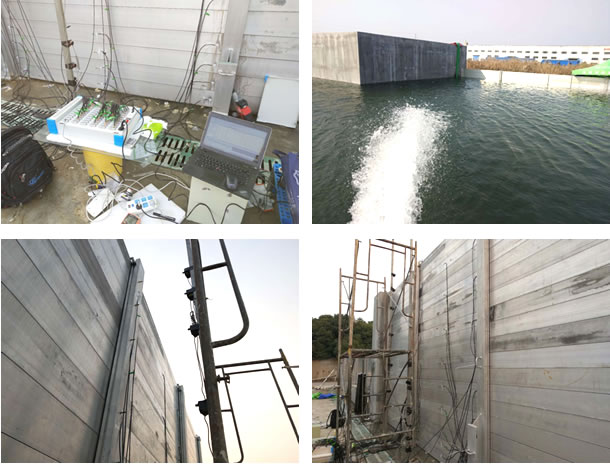模拟防洪堤实验场所,在铝合金防洪堤表面粘贴应变片,在防洪堤的外侧安装拉线位移传感器,用来测量因注水过程对防洪堤坝产生的水平向位移以及应变变化情况;通过专用信号线连接到TZT3826E-60测点设备,通过软件直接采集应变以及水平向位移信号。