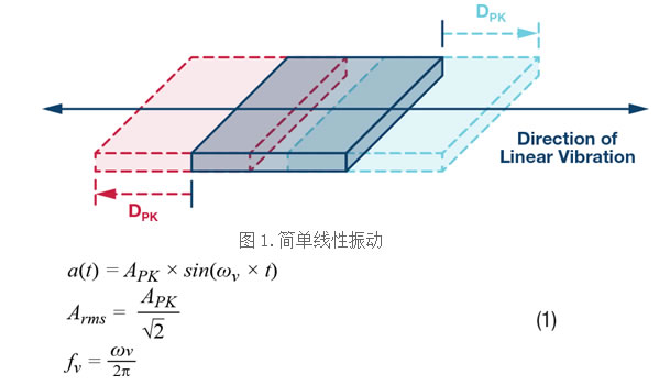 先从惯性运动角度考察线性振动。在此背景下,振动是平均位移为零的机械振荡。对于那些不希望其机器穿越整个车间的人来说,零平均位移非常重要!振动检测节点中核心传感器的价值与它反映机器振动最重要特性的能力高低直接相关。要评估特定MEMS加速度计在这方面的能力,首先必须从惯性运动角度对振动有一个基本了解。图1是振动情况的物理示意图,灰色部分表示中点,蓝色部分表示一个方向的峰值位移,红色部分表示另一方向的峰值位移。等式1提供了一个描述矩形物体瞬时加速度的数学模型,其振动频率为(fV),幅度为ARMs。