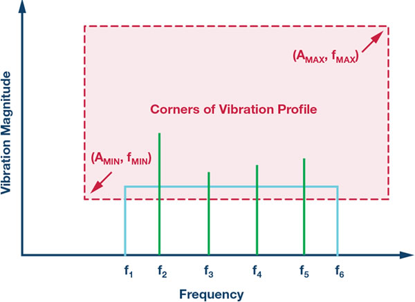 在大部分CBM应用中,机器平台的振动常常有比等式1所示模型更复杂的频谱特征,但此模型为学习发现之旅提供了一个很好的出发点,因为它给出了CBM系统常常会跟踪的两个常见振动特性:幅度和频率。此方法对关键特性到线性速度项的转换也很有用(稍后将有更多说明)。图2提供了两类不同振动模式的频谱视图。第一类(参见图2中的蓝线)在其频率范围(f1到f6)内具有恒定幅度。第二类(参见图2中的红线)在四个不同频率处出现了峰值幅度:f2, f3, f4, 和 f5.