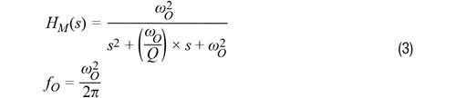 传感器的频率响应描述比例因子(KA)相对于频率的值。在MEMS加速度计中,频率响应主要有两个贡献因素:(1) 其机械结构的响应;(2) 其信号链中的滤波响应。等式3提供了一个通用二阶模型,其近似描述了MEMS加速度计机械部分对频率的响应。在该模型中,fO表示谐振频率,Q表示品质因数。