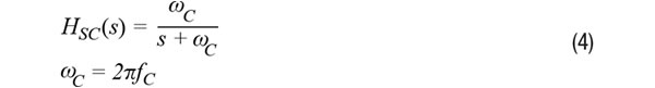 信号链的贡献常常取决于应用所需的滤波。某些MEMS加速度计使用单极点低通滤波器来帮助降低谐振频率时的响应增益。等式4为此类滤波器相关的频率响应(HSC)提供了一个通用模型。在该类滤波器模型中,截止频率(fC)表示输出信号幅度比输入信号低√2倍时的频率。