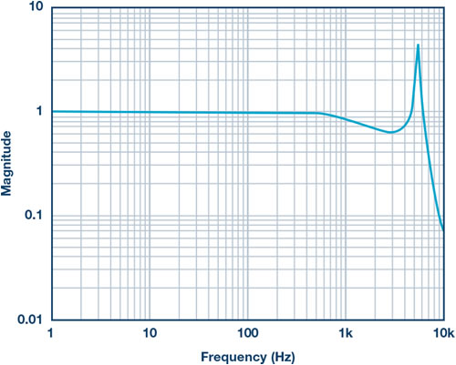 图3直接应用此模型来预测ADXL356(x轴)的频率响应。此模型假设标称谐振频率为5500 Hz,Q为17,使用截止频为1500 Hz的单极点低通滤波器。注意,等式5和等式4仅描述了传感器的响应。此模型未考虑加速度计与其监控的平台的耦合方式。