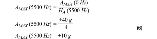 注意,测量范围与频率有一定的关系,因为传感器的机械响应会引入某种响应增益,增益响应的峰值出现在谐振频率时。对于ADXL356的仿真响应(参见图3),增益峰值约为4倍,故测量范围从±40 g降至±10 g。等式6提供了一种分析方法来预测此值,它以等式5为出发点: