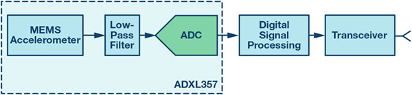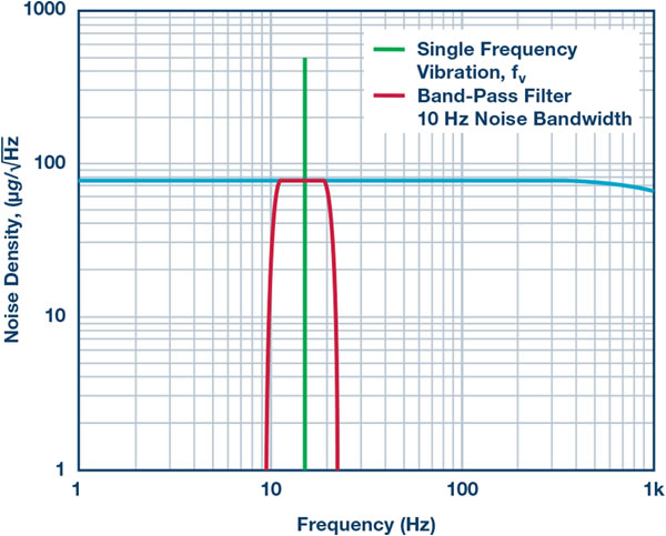 利用等式9中的关系,我们可以估计:当对ADXL357(噪声密度为80 μg/√Hz)使用噪声带宽为100 Hz的滤波器时,总噪声将为0.8 mg (rms)。