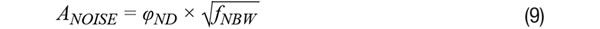 等式9提供了一个用于估计MEMS加速度计测量总噪声(ANOISE)的关系式,其中使用了噪声密度(φND)和与信号链相关的噪声带宽(fNBW)。