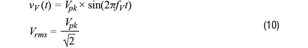 某些CBM应用需要用线速度来衡量核心加速度特性(范围、带宽、噪声)。进行这种转换的一种方法是从图1所示简单模型开始,并使用同样的假设:线性运动、单一频率和零平均位移。等式10通过图1中物体瞬时速度(vV)的数学关系式表述了该模型。此速度的幅度(表示为均方根rms)等于峰值速度除以√2。