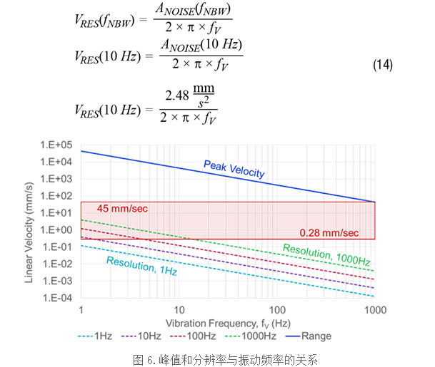 本案例研究的下一步是整理等式12中的关系,以导出一个简单的公式(参见等式14)来将总噪声转换为线速度项(VRES、VPEAK)。除了提供此关系的一般形式之外,等式14还提供了一个特定例子,其使用10 Hz的噪声带宽(及2.48 mm/s2的加速度噪声)。图6中的四条虚线表示所有四种噪声带宽下相对于振动频率(fv)的速度分辨率。
