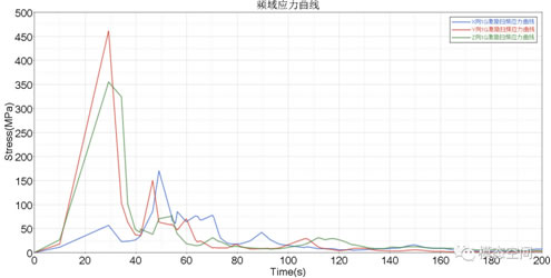 图1展示了某电池包分别承受X、Y和Z向加速度激励时,壳体上某点的Von Mises应力频响曲线。