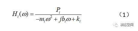 其中Hi(ω)为第i阶模态坐标的频率响应函数,Pi、mi、bi和ki分别为第i阶模态力、模态质量、模态阻尼和模态刚度。