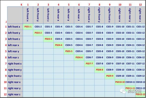 所以,只要有各载荷的频响函数Hr(ω),我们就可以根据激励载荷的PSD矩阵来求得结构上各点的PSD应力。图4展示了一个卡车车身的载荷PSD矩阵,,共有12个载荷通道,构成12*12的PSD矩阵,其中对角项为各载荷的自功率谱密度函数,非对角项为互功率谱密度函数。