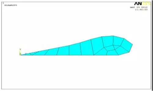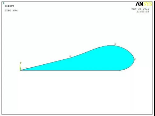 在分析过程采用直线段和样条曲线简化描述机翼的横截面形状,选取5个keypoint,A(0,0,0) 为坐标原点,同时为翼型截面的尖点;B(0.05,0,0) 为下表面轮廓截面直线上一点,同时是样条曲线BCDE的起点;D(0.0475,0.0125,0) 为样曲线上一点。C(0.0575,0.005,0) 为样条曲线曲率最大点,样条曲线的顶点;点E (0.025,0.00625,0) 与点A构成直线,斜率为0.25。通过点A、B做直线和点B、C、D、E作样条曲线就构成了截面的形状,如图2。沿Z方向拉伸,就得到机翼的实体模型,如图1。