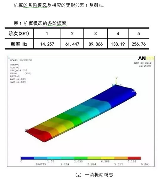 在一阶 (14.257Hz) 和二阶 (61.447Hz) 振动模态下,机翼主要发生弯曲变形,并且离翼根越远变形量越大;