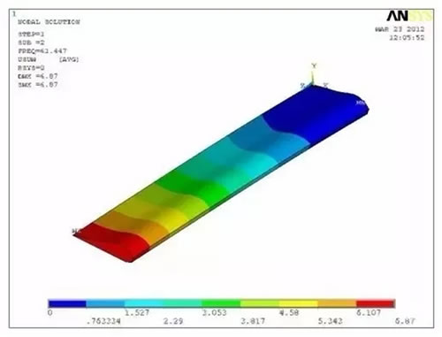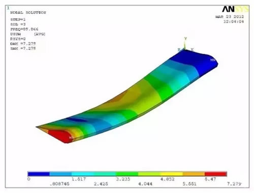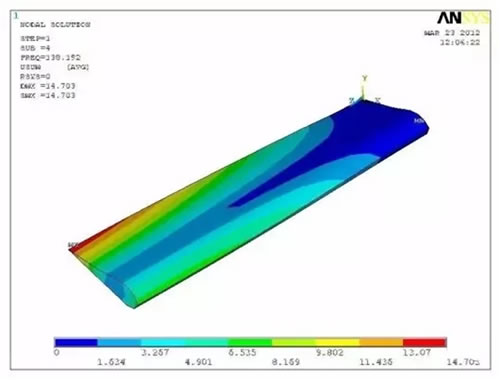 在三阶 (89.866Hz) 振动模态下,机翼发生了弯曲变形和轻微的扭转变形,弯曲变形大,机翼的外形发生明显改变;