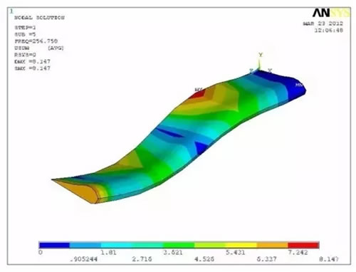 在5阶 (256.76Hz) 振动模态下,机翼发生了严重变形,机翼变形复杂,弯曲为主,含有多种变形;中间弦线两侧发生方向相反的弯曲变形,外形变形严重。