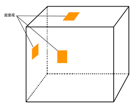 将岩石块打磨成一个正方体(长方体也可),注意打磨表面一定要保持光滑,不可有毛刺、裂纹等瑕疵。然后在相邻的三个平面上贴上直角应变花,示意图如下所示: