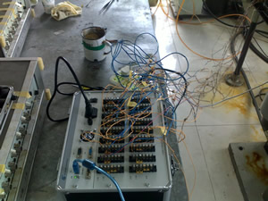 应变花输出线使用φ 0.5的漆包线(引出线长度根据被测物体到静态测试仪之间的距离而定),注意焊接点处漆一定要刮干净,确保焊接点的机械强度。然后使用标签纸将应变花的输出线做好编号标识(共9根,按编号1~9排列)。用万用表的电阻档测量每路的应变片输出阻值是否正确。