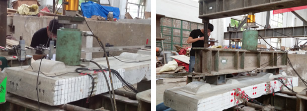 在轨道板预设部位安装应变片和顶杆位移计,通过压力机逐级加载,测试在自由状态和工作固定状态下,轨道板的应变和位移值