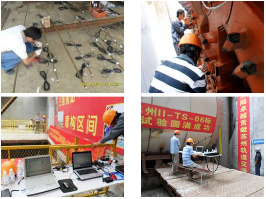 中铁十三局集团有限公司联合北京交通大学对苏州地铁2号线进行盾构切削钢筋砼桩试验。使用TST3826、TST3829测量盾构机刀头在切割时所受应力和混凝土桩里预埋的钢筋所受应力。