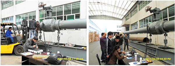 在阀门及周边管道的主要承载点粘贴三轴应变花,扭矩测量位置粘贴好应变片,安装好拉力传感器、液压传感器、位移传感器,将所有通道一次性全部接入 TZT3826-60 测点,试验过程分别按不同等级的拉压和液压来加载,并在电脑上通过 TZTDAS3826 信号分析软件对所有通道的数据进行实时采集、实时显示。