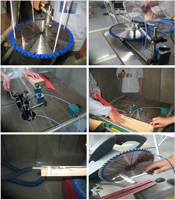 锯片在工作情况下,会产生较大的横向振动,直接影响加工精度。应博世电动工具(中国)有限公司邀请,对已有锯片各种状态下(自由状态,工作固定状态)的动力学特性进行试验测试,掌握锯片的动力学特性,结合有限元技术合理的修改锯片的局部结构(诸如直径、厚度等),可以有效的控制控制锯片工作过程中的振动量级。测试圆锯片 ( 包括自由状态、夹持不动状态以及工作状态下)固有特性以及工作过程中的振动、噪声和温度情况,为生产厂家改进锯片设计提供试验基础数据。