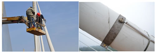 斜拉索索力测试采用振动法,即在拉索上绑扎加速度传感器,通过拉索振动频率的变化,判断拉索索力变化。
