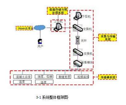 从用户的角度来说,健康监测系统大体可以分为软件子系统和硬件子系统。软件子系统是用户与硬件间的接口界面,主要作用有对采集参数进行人工干预、存储并查看数据、数据分析等。硬件子系统负责完成自动化的数据采集,主要包括传感器及其相应的数据采集传输设备、综合布线、测站设备、监控中心设备和相关的辅助设备等。安装此套硬件系统的主要目的是为结构状态识别及局部损伤识别采集所需要的数据,因此要求硬件系统需要实现以下功能: