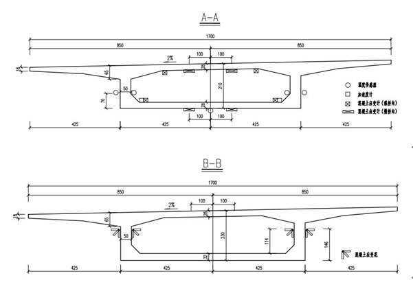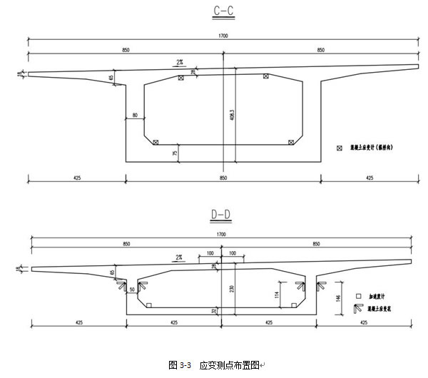 部分预应力混凝土组合箱梁既是形成连续梁桥的主要构件之一,同时又直接承受着车辆荷载的作用,通过对主梁各控制截面应力裂缝(应变)进行监测,不仅能直接了解各测点处的裂缝应力(应变)状态,而且为总体评判桥梁的安全性和耐久性提供依据,而且还能通过控制点裂缝应力(应变)状态变化来发现桥梁结构状态的变异。