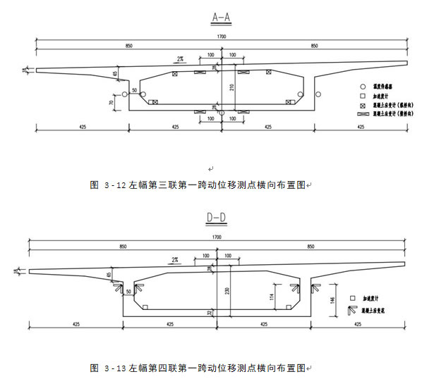 动位移监测布置在第三联第三跨跨中截面,第四联第一跨中界面,横向布置见图 3 - 12和图 3 - 13,左右幅动位移测点各4,共计8个。