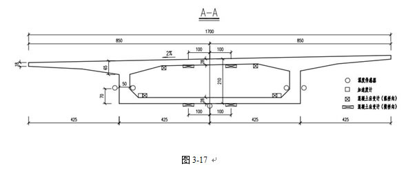 温度传感器布置在第三联第一跨跨中截面,横向布置见图 3 - 17温度测点右幅和左幅各5个,共计10个。