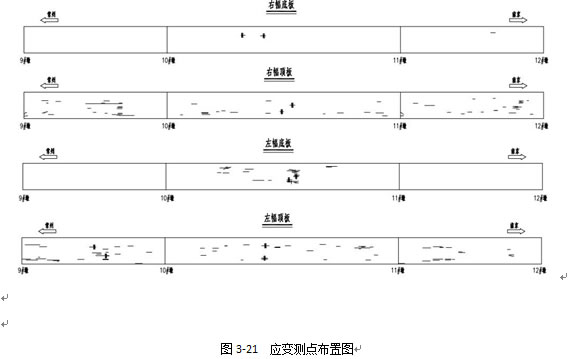 根据结构的实际受力特点,并考虑到现场条件,选择将左幅和右幅第二联第五跨跨中截面作为应变监测截面,各截面测点横向布置见图 3 - 3左幅和右幅各布置12个应变测点,共计24个;应变花各6个,共计12个。