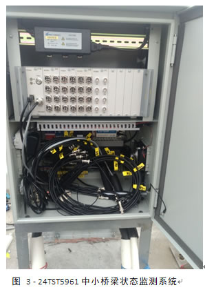 根据监测方案要求,监测设备共两台,分别位于第三联中间隔离带处。第一组设备应变测点18个通道,动位移4个通道,温度10个通道;第二组设备应变测点个24通道;第三组设备应变测点8个通道;第四组设备应变24个通道动位移8个通道。
