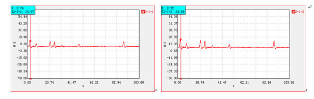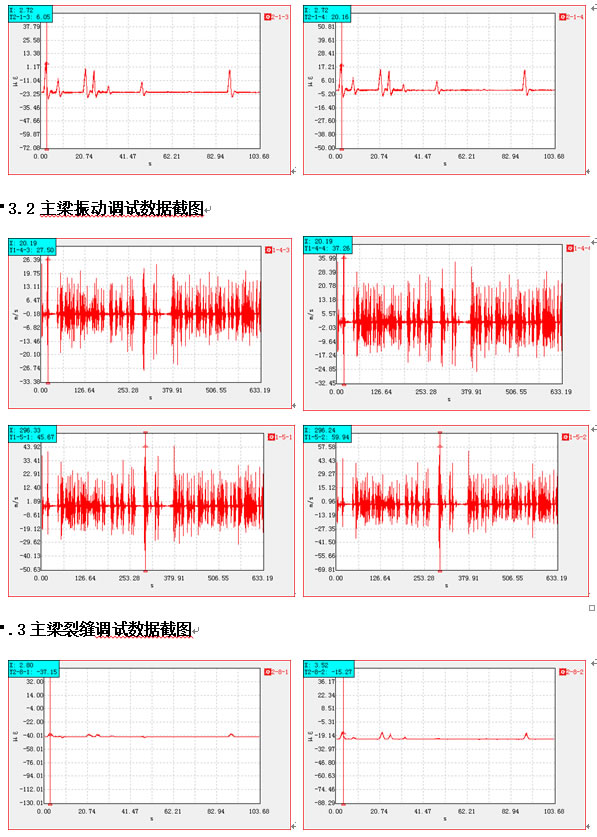 整个系统安装完成后,采用单机版软件在桥上对所有信号进行调试。分别采集了应变、动位移、温度以及裂缝信号,确保所有通道的正常运行。通过现场调试,初步判断通道测点G1,G3,G4信号存在异常。