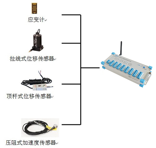 1、技术参数 1.2 适用应变计电阻值: 1.2.1 1/4桥(120Ω两线制公共补偿)、半桥、全桥:60Ω~10000Ω任意设定; 1.2.2 1/4桥(120Ω三线制自补偿):120Ω或350Ω(订货时确定一种) 1.3 最高采样速率: 1.3.1ZigBee通讯时最高采样速率1Hz/测点; 1.3.2以太网通讯时最高采样速率5Hz/通道; 1.4 应变计灵敏度系数:1.0~3.0自动修正; 1.5 供桥电压(DC):2V; 1.6 桥路类型:1/4桥(120Ω三线制自补偿)、1/4桥(120Ω两线制公共补偿)、半桥、全桥; 1.7 测量应变范围:±20000με; 1.8 最小分辨率:1με; 1.9 电压量程:±20mV,±5000mV; 1.10 系统示值误差:不大于0.5%±3με; 1.11 零漂:不大于3με/4h(单次采样条件下测量); 1.12 自动平衡范围:±15000με(应变计阻值的±1.5%); 1.13 长导线电阻修正范围:0.0~100Ω; 1.14 无线通讯:ZigBee无线网络通讯实现无线静态应变测量。在视距情况下,模块间通讯距离最远可达500m; 1.15 内置缓存容量:8G; 1.16 最长工作时间:12小时; 1.17 外形尺寸: 1.17.1应变采集模块:222mm(长)×110mm(宽)×32mm(高); 1.17.2无线通讯控制器:65mm(长)×30mm(宽)×16mm(高); 1.18 仪器自重: 1.18.1应变采集模块:约0.8kg; 1.18.2通讯控制器:约0.1kg。 2.1温度: ⑴贮存条件:-40℃~60℃ ⑵极限条件:-10~50℃ ⑶工作范围:0~40℃ 2.2湿度: ⑴工作范围:40℃(20~90)%RH ⑵贮存条件:50℃ 90%RH24h 2.3振动(非工作状态): ⑴频率循环范围:5~55~5Hz ⑵驱动振幅(峰值):0.19mm ⑶扫频速率:小于或等于1倍频程/min ⑷在共振点上保持时间:10min ⑸振动方向:x、y、z |